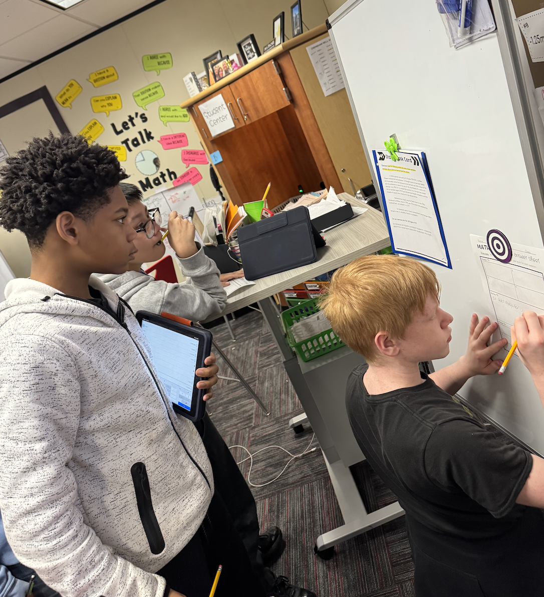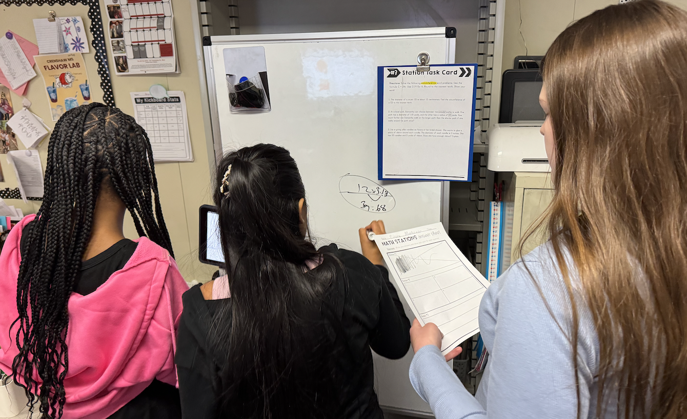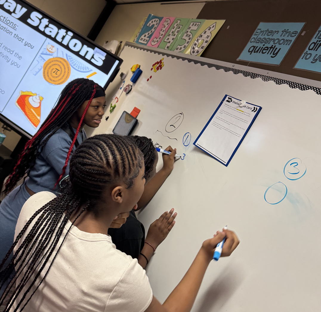 Students in Miss Wilgus’ 7th grade class put their math skills to work as they tackled π (3.14) word problems through engaging station activities. Working in teams of two, students collaborated and reasoned through real-world problems involving circles, helping each other make sense of how π connects to circumference and area.