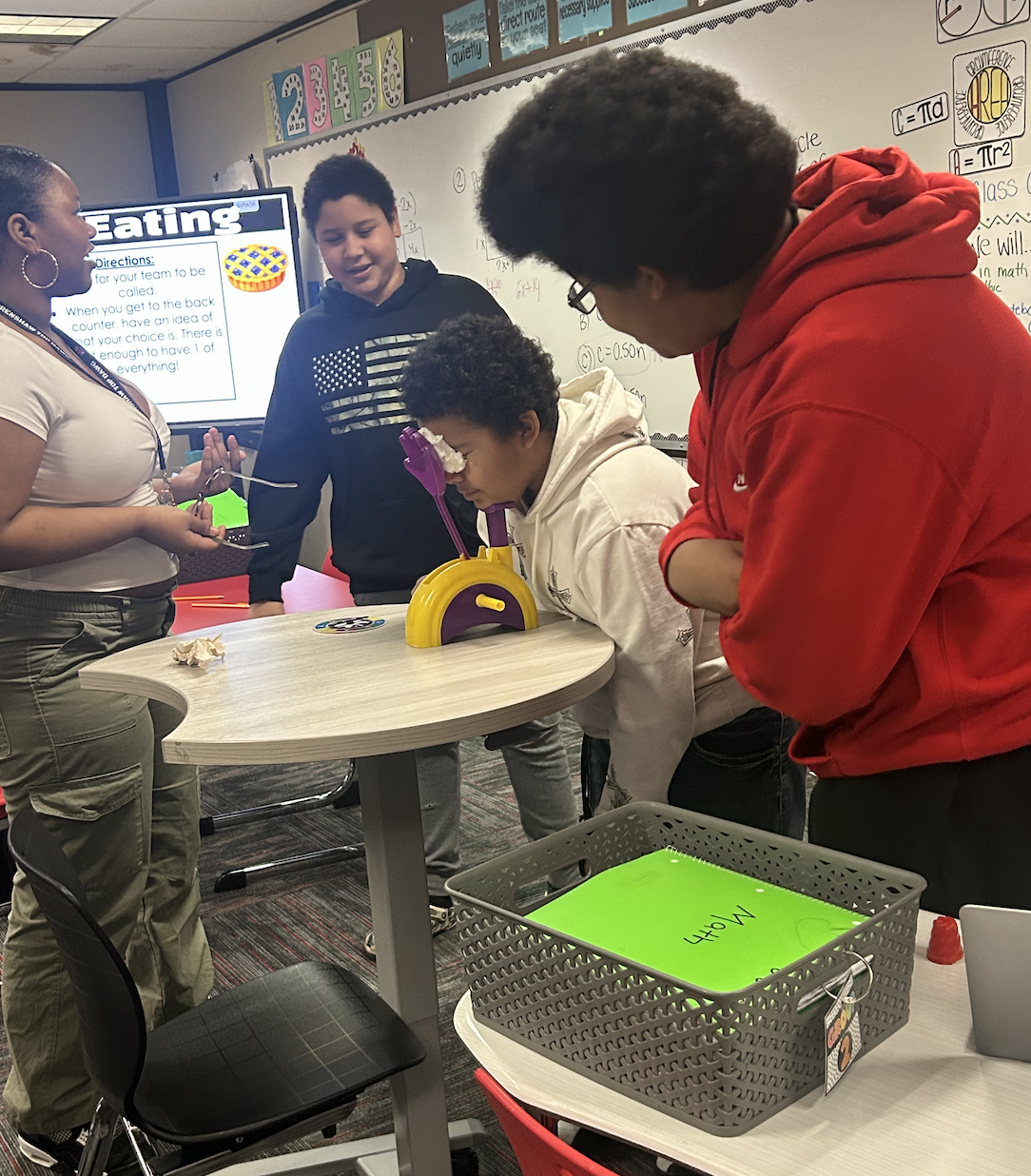 Students also had a blast playing “Pi Face,” adding a fun, high-energy twist to the lesson! To wrap up the day and celebrate their hard work, students even enjoyed actual pie. A memorable way to bring math to life while reinforcing teamwork, problem solving, and a little Pi Day fun!
